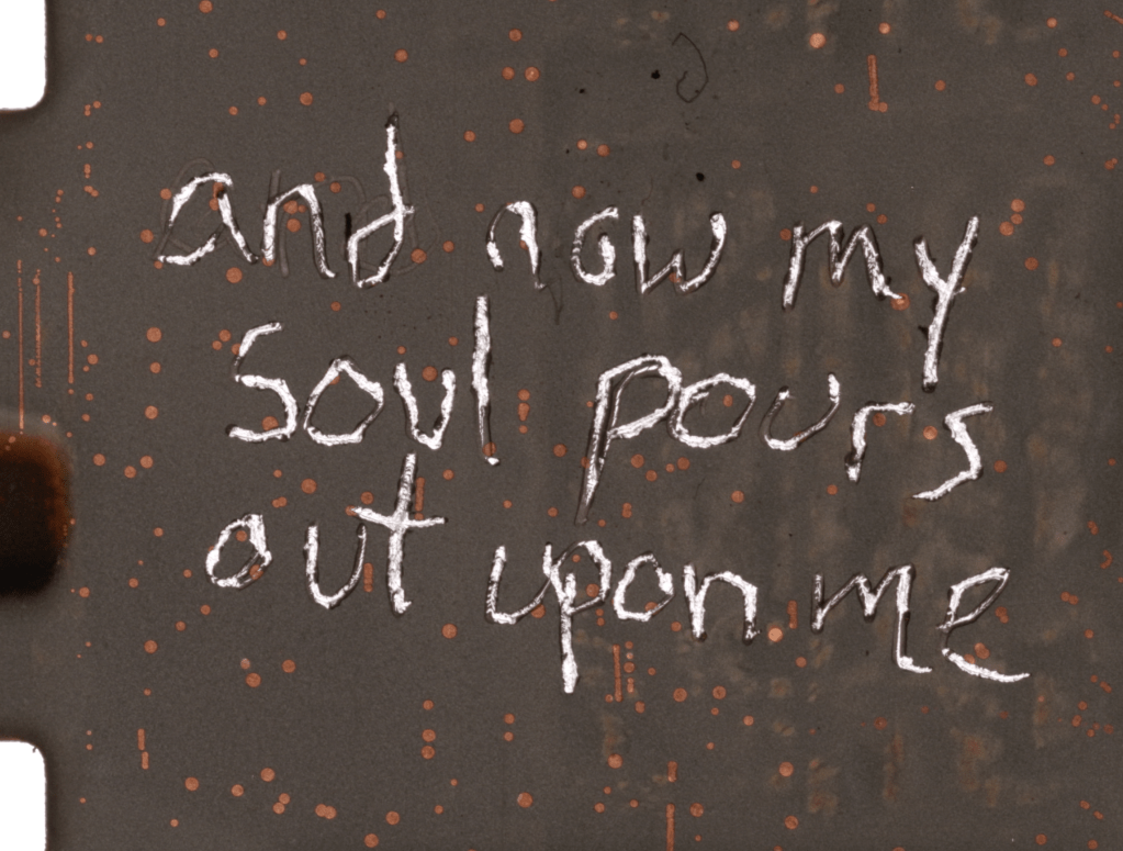 A short, experimental 16mm work predicated on process as product. Hand developed 16mm reversal B&W film will serve as medium for an exploration of the strands linking material filmmaking, traumatic experience, and religious experience.
